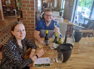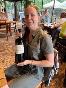 Med en absolutt nydelig utsikt over vinmarkene i Heldenberg i solnedgang møter jeg salgsrepresentant Delaine Immelmann og assisterende vinmaker hos vinhuset, Lucilia Ramos til mat og vinsmaking.